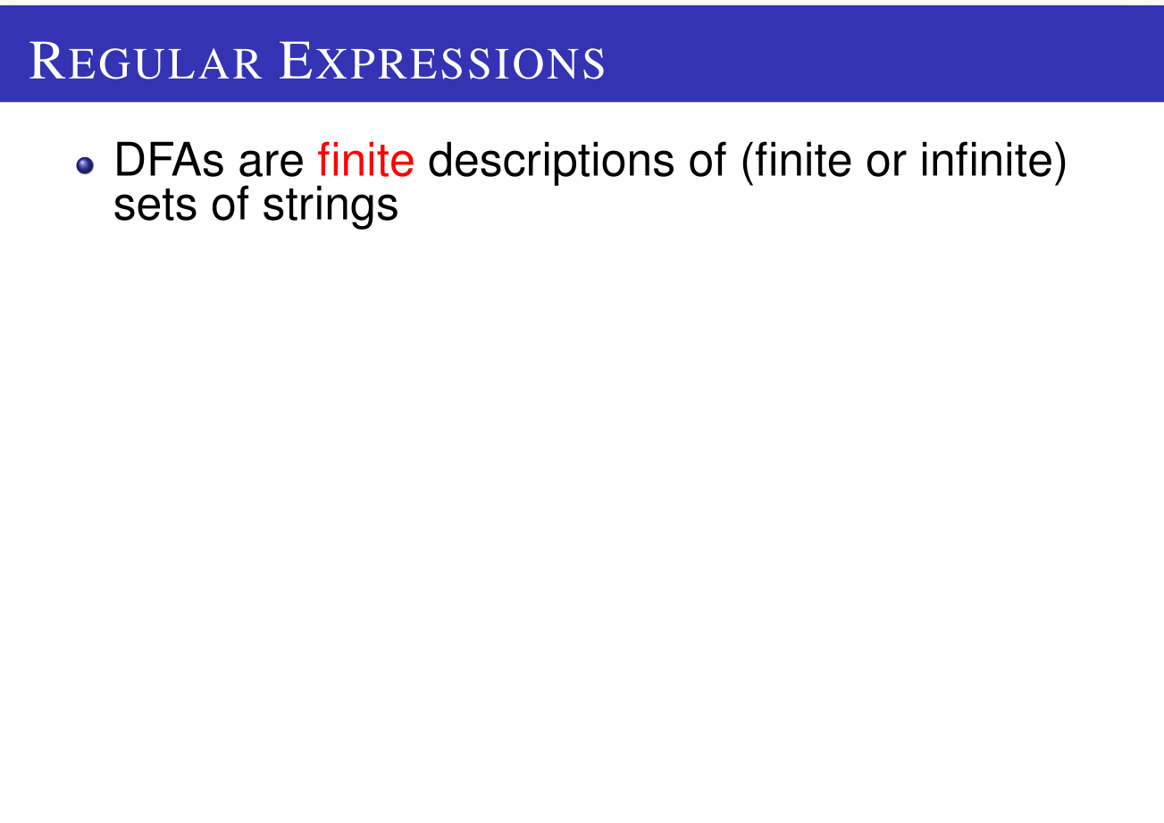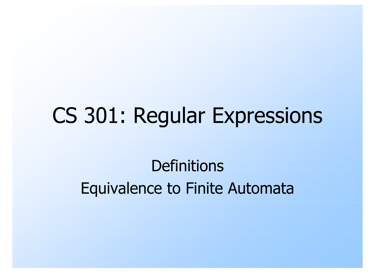 tl;dr: Explains regular expressions as an algebraic framework equivalent to DFAs for describing regular languages, covering syntax, identities, and practical pattern examples. It also shows how to systematically convert regular expressions to NFAs, including constructions for union, concatenation, star, and generalized transitions.